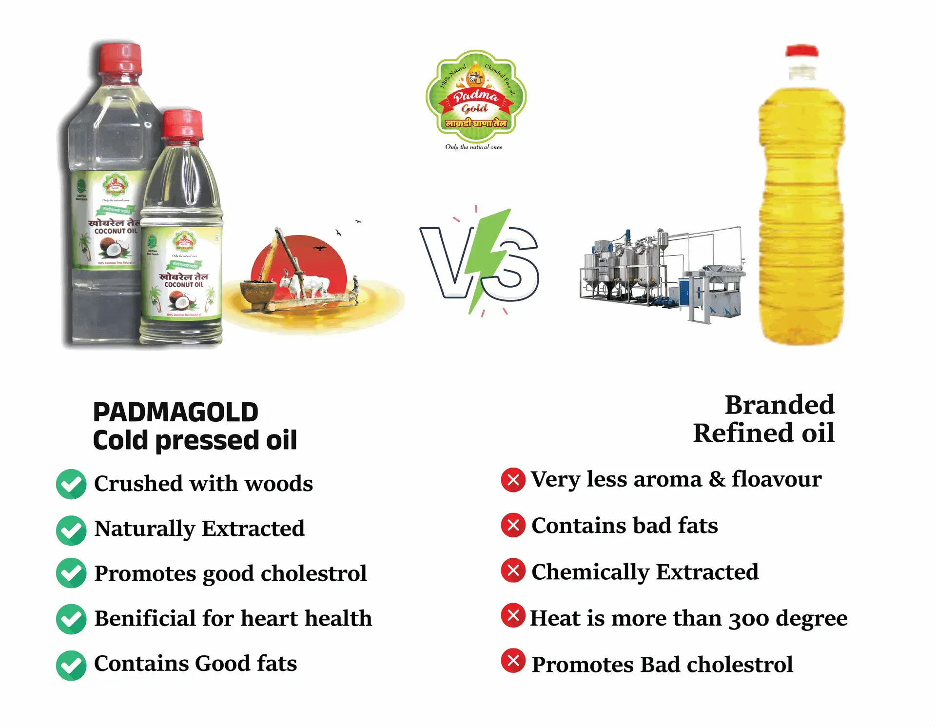 Cold-pressed or wood-crunched (Padma gold lakdi ghana) oils are better than refined oils because they retain essential nutrients, vitamins, and antioxidants, thanks to their low-temperature extraction process. These oils are free from chemicals and additives, making them a more natural and healthier option. They also preserve the natural flavor and aroma of the oil, enhancing the taste of food. Additionally, cold-pressed oils are rich in healthy fats and undergo minimal processing, keeping them closer to their natural state, unlike refined oils, which often lose quality due to high heat and chemical treatments.